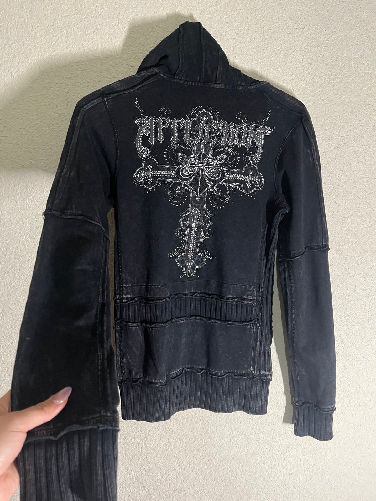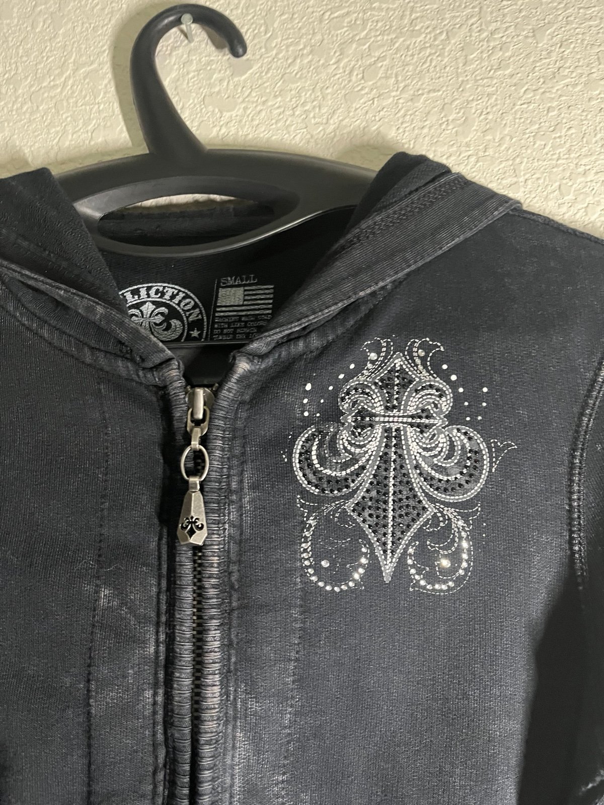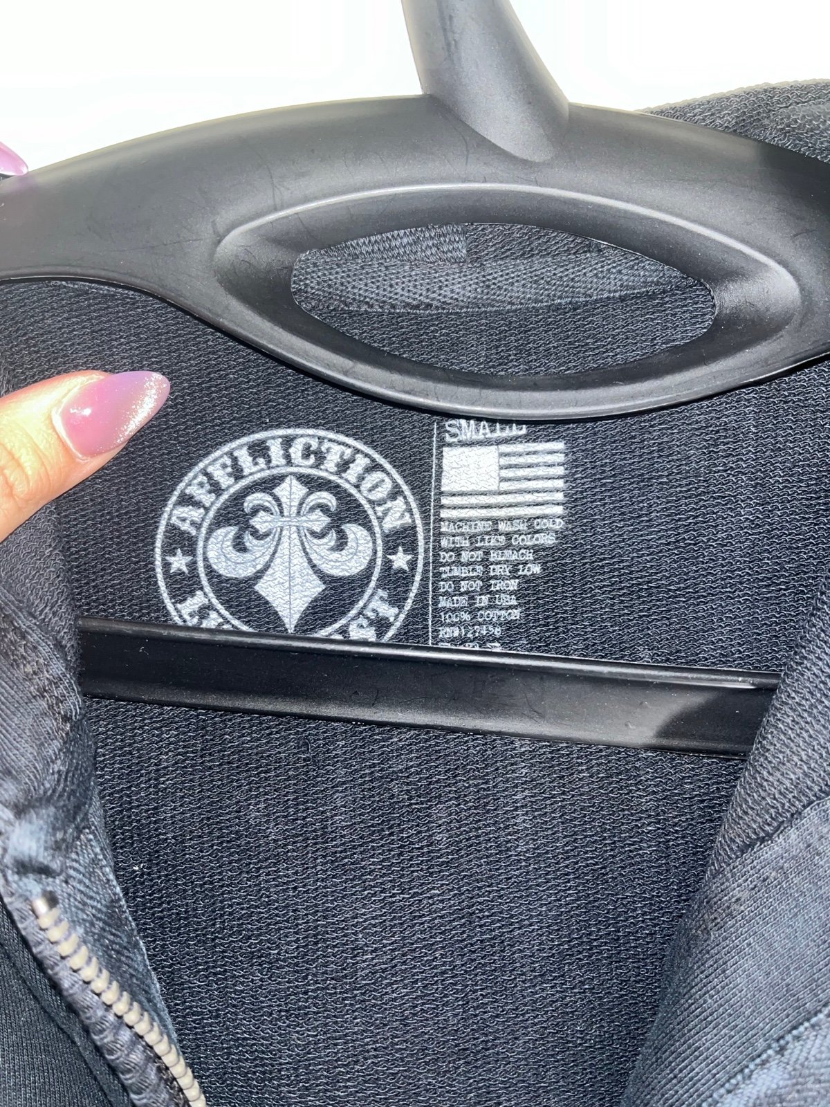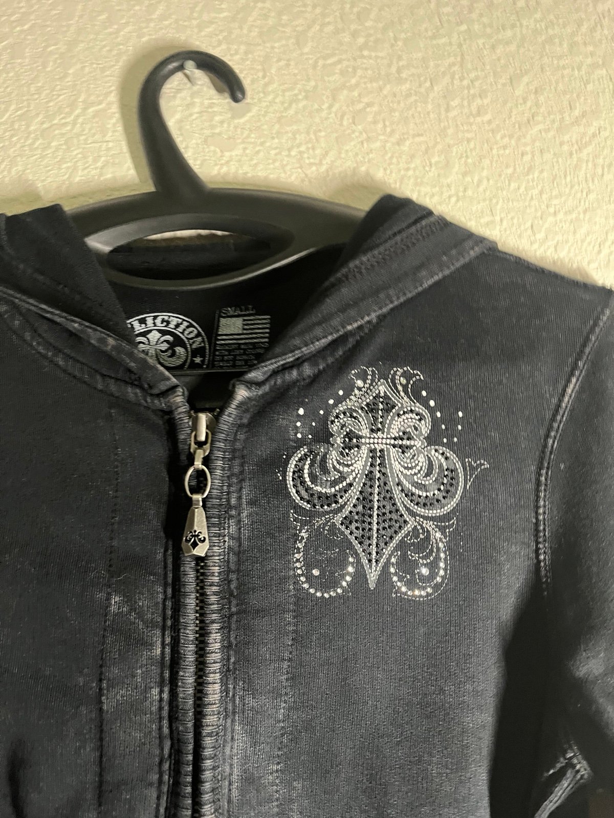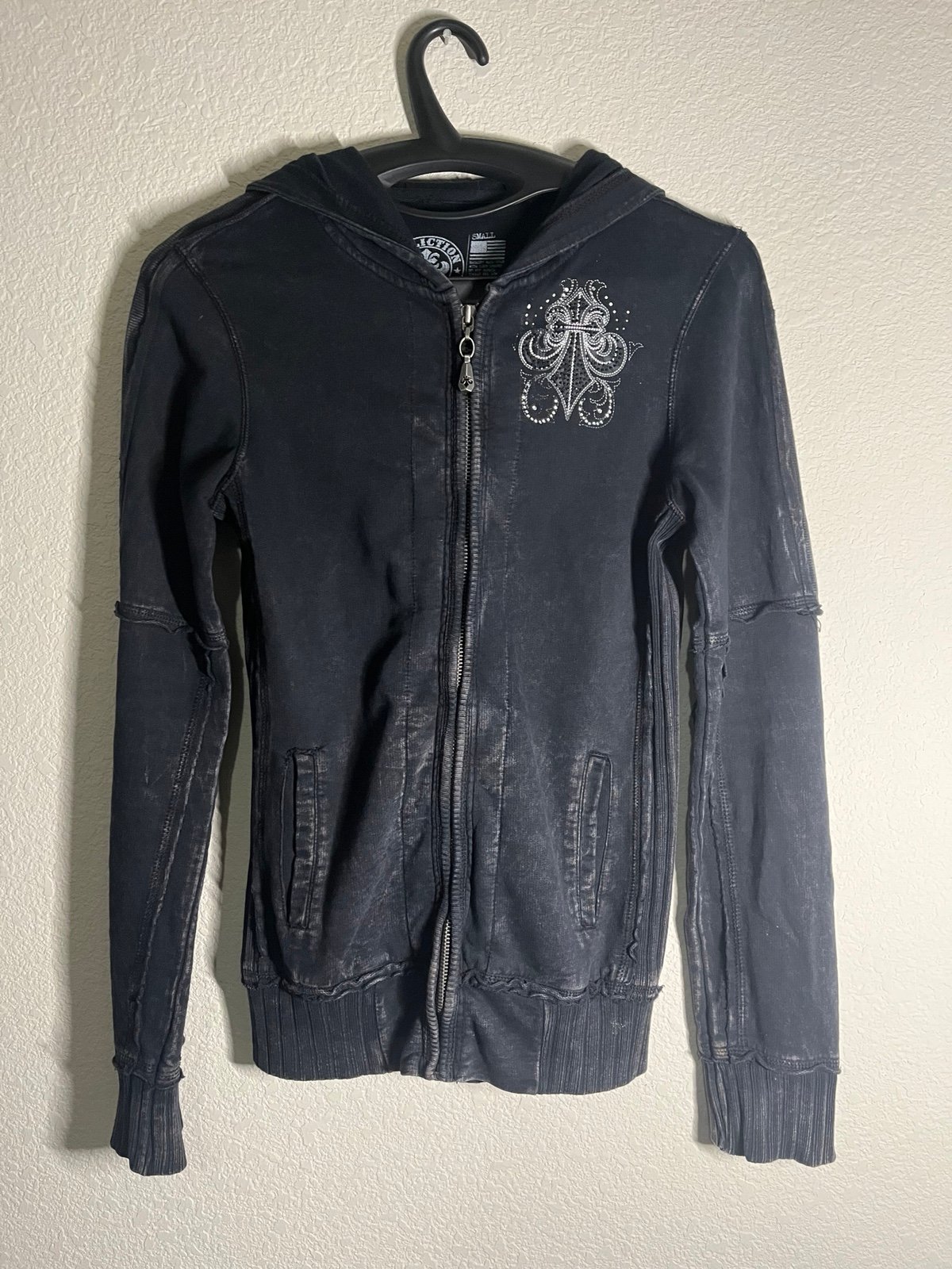 affliction live fast black and silver bedazzled cross zip up jacket size s washed look