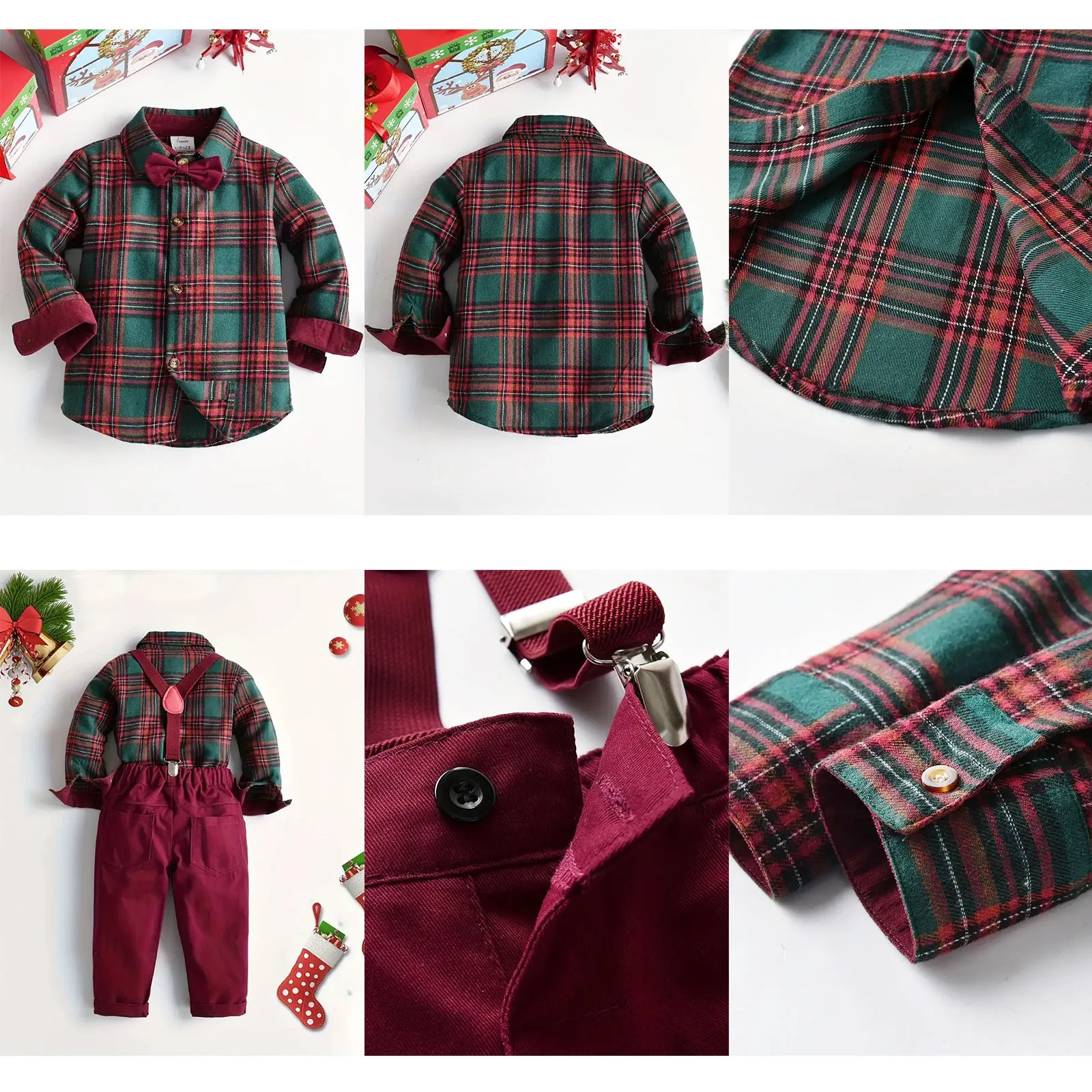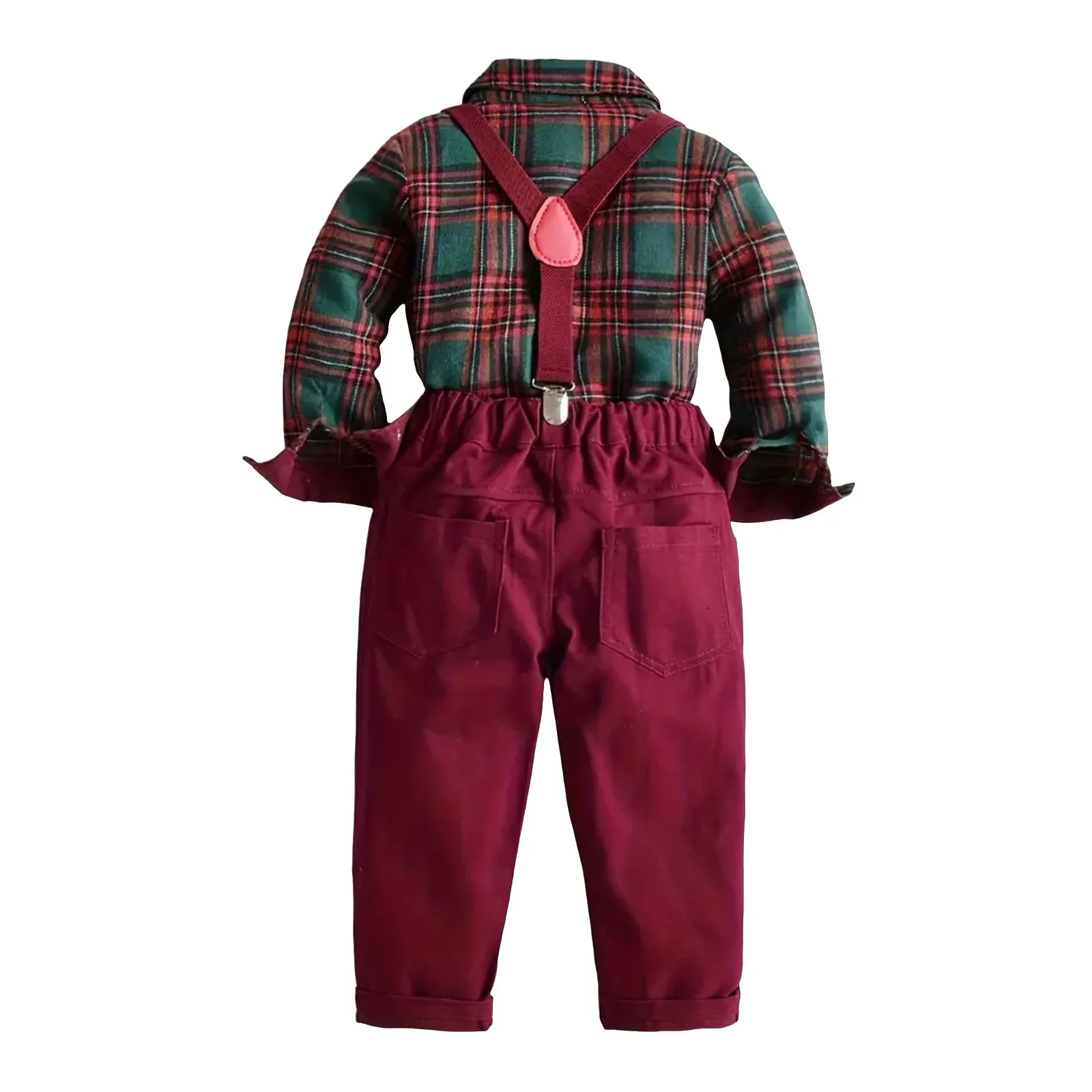 2 pieces outfit: dress shirt with bow-tie + matching detachable suspender pants,Soft, breathable and skin friendly fabric