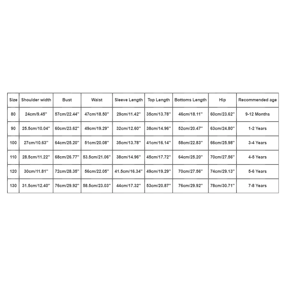 | Size:100 | Shoulder width:27cm/10.63'' | Bust:64cm/25.20'' | Waist:51cm/20.08'' | Sleeve Length:35cm/13.78'' | Top Length:41cm/16.14'' | Bottoms Length:58cm/22.83'' | Hip:66cm/25.98'' | Recommended age:3-4 Years |