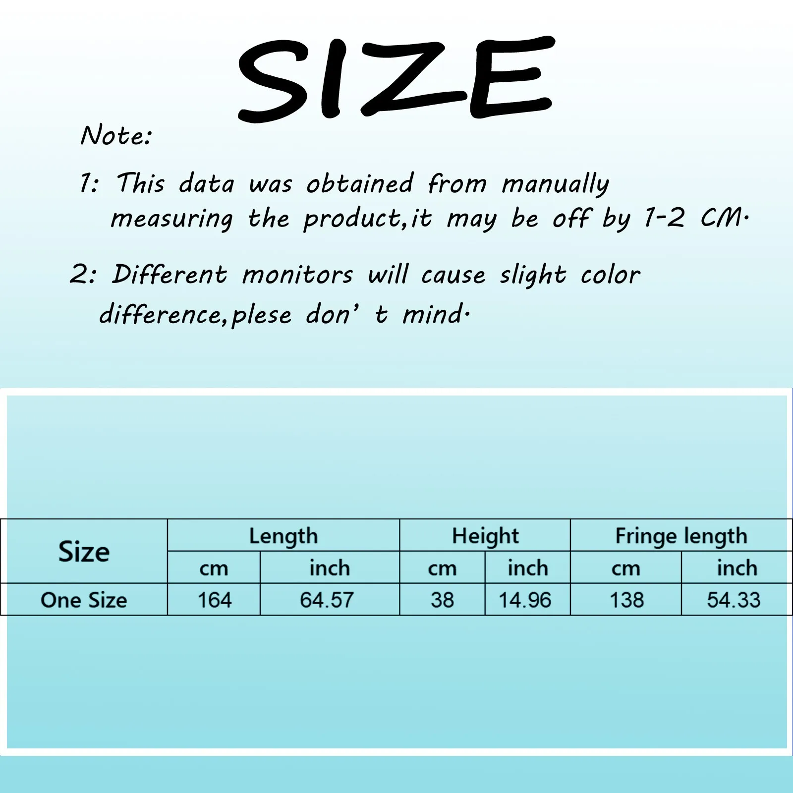 | Size:One Size | Length :164cm/64.57'' | Fringe length :138cm/54.33'' | Height :38cm/14.96'' |