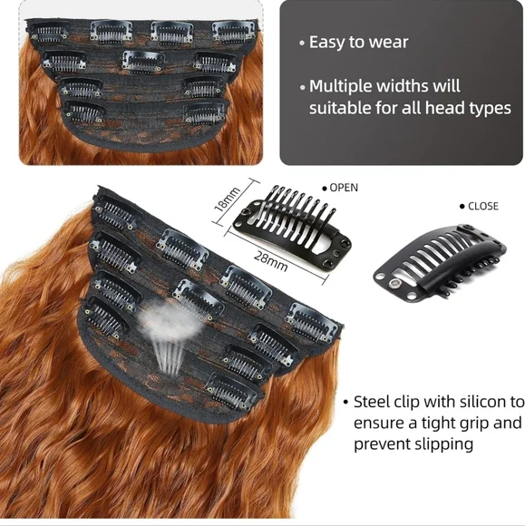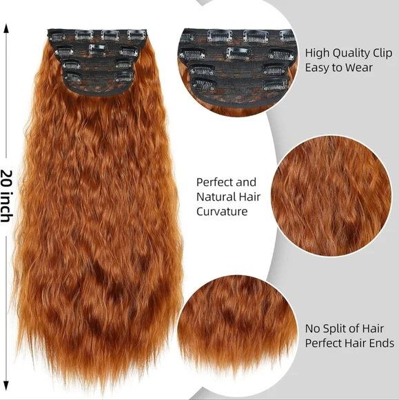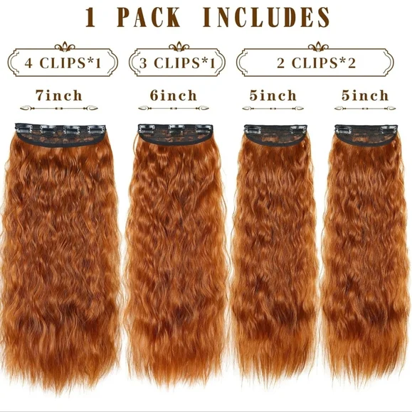 Package Content:4PCS clip in hair extensions of 20 inches 180g in total. Each package includes: 1 piece of 7 inches wide weft with 4 clips; 1 piece of 6 inches wide weft with 3 clips; 2 pieces of 5 inches wide weft with 2 clips. You can choose the number of pieces to wear according to your needs.New Style, New Surprises:This is a new style of hair extension, this unique curl is very beautiful, will surprise you. Compared to traditional hair extensions, 4pcs clip in hair extensions can provide you with more volume with no glue, no tape, causing no damage to your hair and scalp and with less shedding. Vigorous clip in extensions are made with heat resistant fiber synthetic but look completely natural like real.