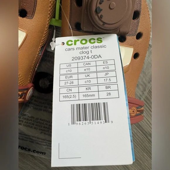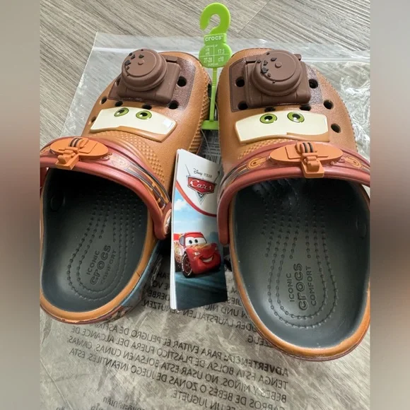 CrocsNWT and In BagSize: C10 (Toddler)Who’s Up for Some Tractor Tippin’? Mater Just Pulled Up to Join His Best Friend, Lightning McQueen, in our Collection of Disney and Pixar Cars Classic Clogs. Each Pair Features Cars Illustrative Graphics Unique to Tow Mater. Delight in Soft TPU Details Like an Exposed Engine on the Toe and Tow on the Heel Strap. Ultra-Comfy Cushioned Footbeds Will Have Your Feet Happier ‘n a Tornado in a Trailer Park! Mater Classic Clog Details:-Croslite Foam Outsoles for Better Traction, Support, and Comfort-Pivoting Heel Straps That Let You Choose Between Clog and Slide StyleMade By Crocs, Renowned For Their Comfort, These Clogs are Perfect for Any Little One on the Go!*See Photos for Official Size Chart From Crocs Website**Size Sold Out Online!