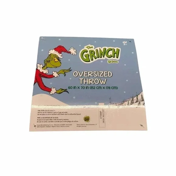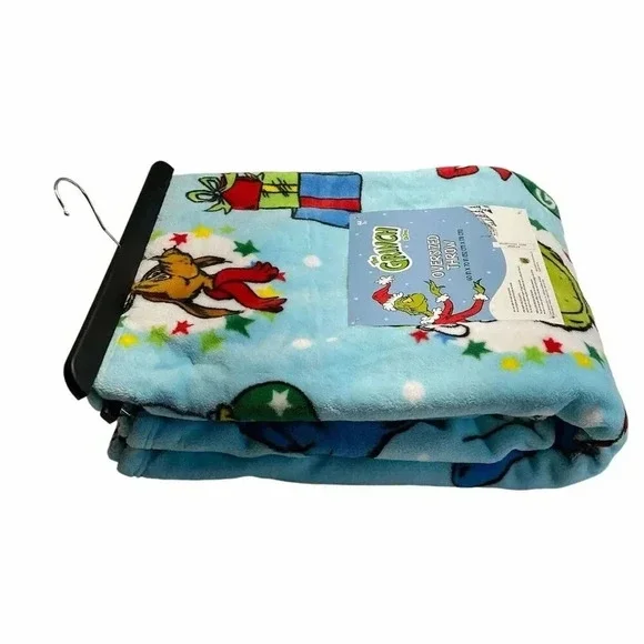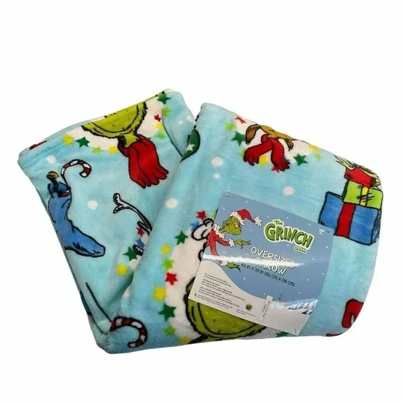 Snuggle up in holiday spirit with this Dr. Seuss The Grinch Max Christmas Throw Blanket! Featuring a playful design of the Grinch, Max, candy canes, and colorful presents on a cheerful blue background, this oversized 60x70 inch throw is perfect for keeping cozy during the Christmas season. The vibrant, festive pattern brings a touch of whimsy to any room, making it a great addition to your holiday décor.Whether you’re watching holiday movies, sipping hot cocoa, or simply staying warm on chilly nights, this soft and plush blanket is sure to make your winter days more enjoyable. It also makes a wonderful gift for any Grinch fan or lover of festive, fun blankets!