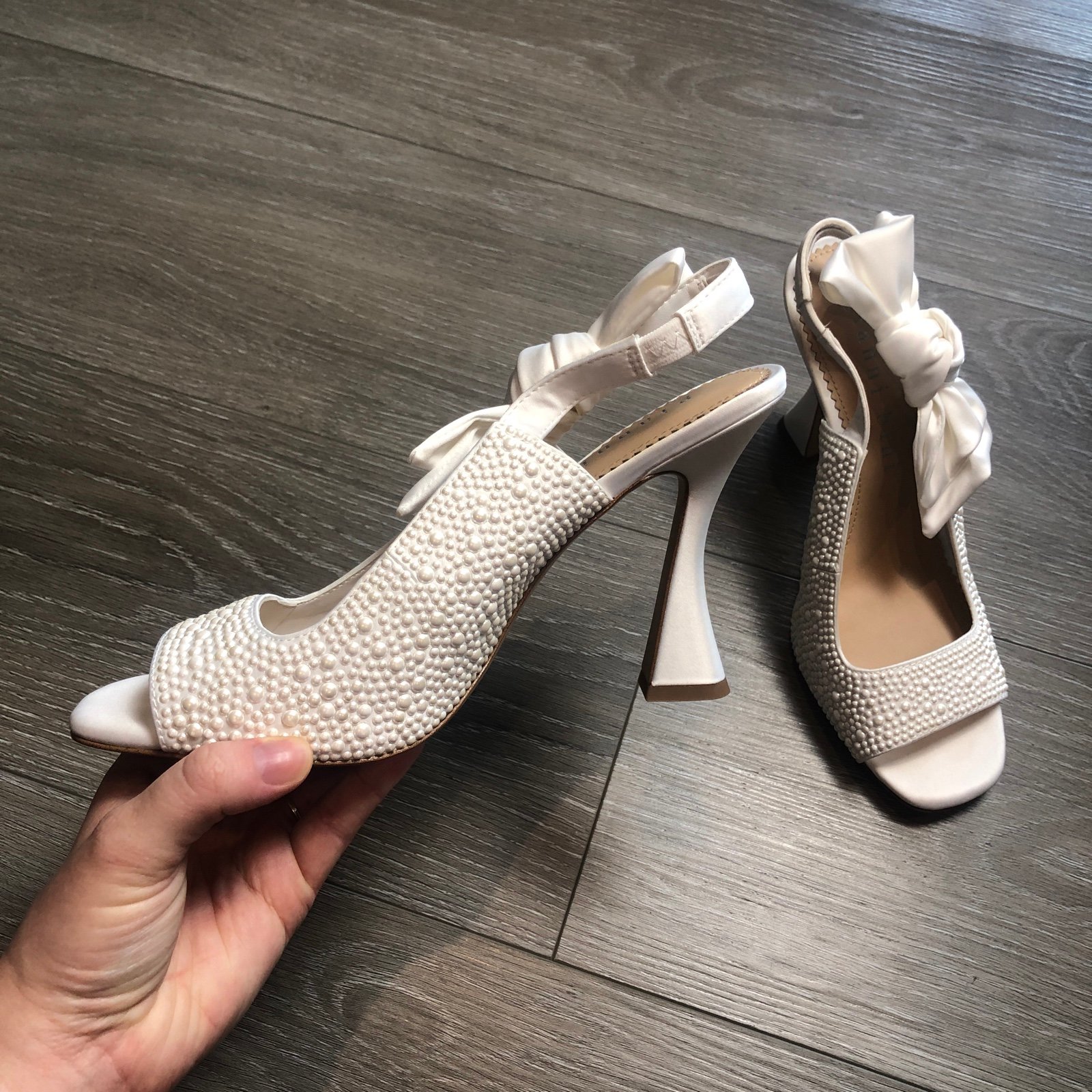 The Gianni Bini Coraythree Pearl Embellished Satin Slingback Bow Wedding Heels in size 9 are luxurious and elegant heels designed for special occasions like weddings, proms, and formal events. These ultra-high heels feature a solid white color with pearl embellishments and a bow detail, embodying the theme of bridal, bridesmaids, and going out. Made of leather with a block heel, these slingback heels have an ankle strap for added comfort and style. Perfect for adding a touch of glamour to any outfit, these Gianni Bini heels are a must-have for any fashion-forward woman. Comes from a smoke free home and pet friendly home. Features: faux pearl studded satin upper, statement satin size bow detail, slip on with gored sling strap, synthetic lining and outsole, item #20550739 original price $140