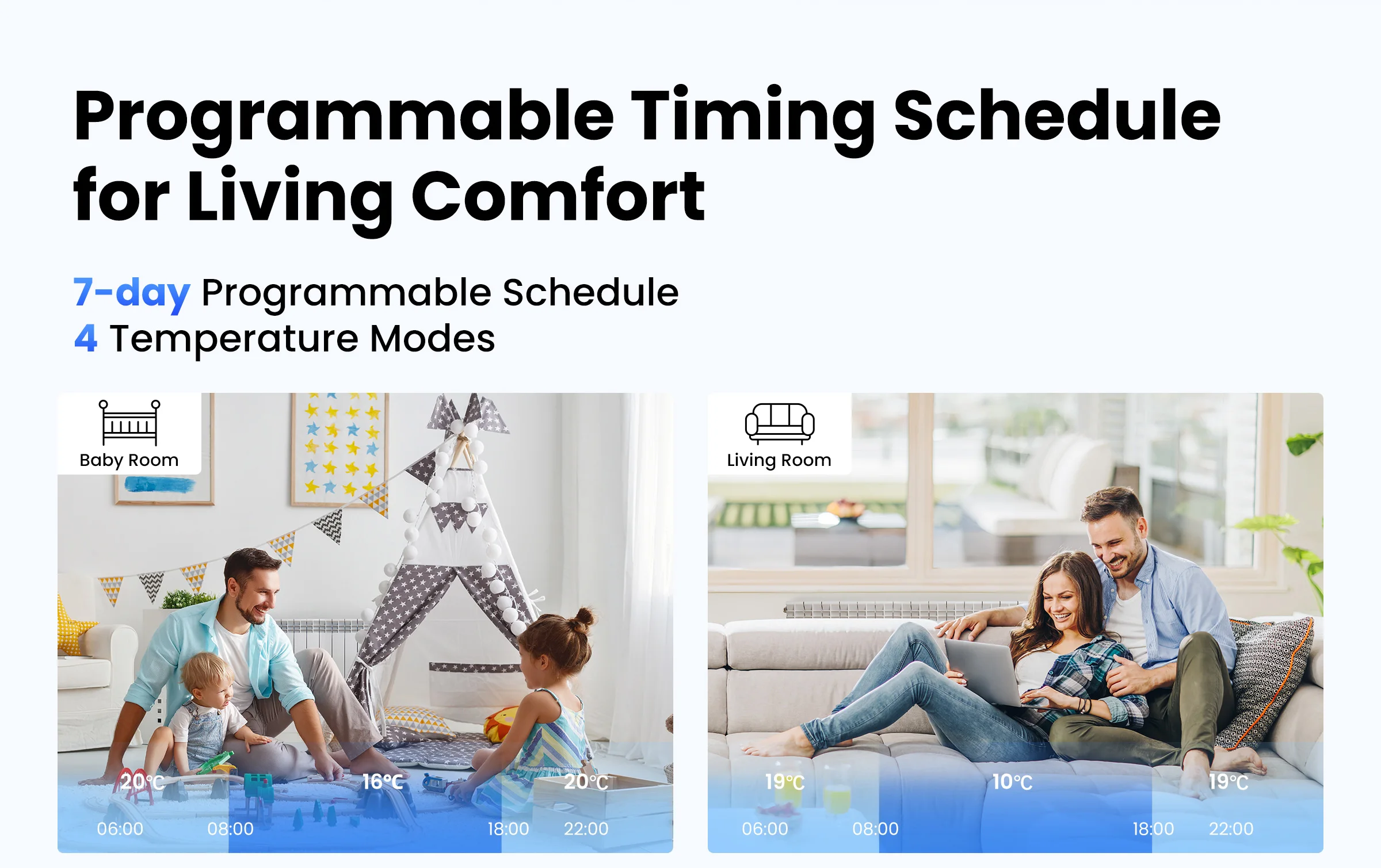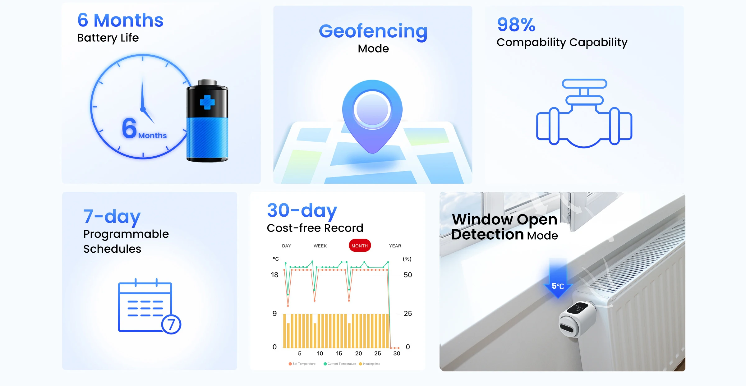 Adopting PID algorithm to ensure efficient temperature control. The errors are less than 1 ℃. Programmable heating timer, Eco mode, and smart scenes optimize your temperature control, while window open detection automatically adjusts to prevent energy waste.