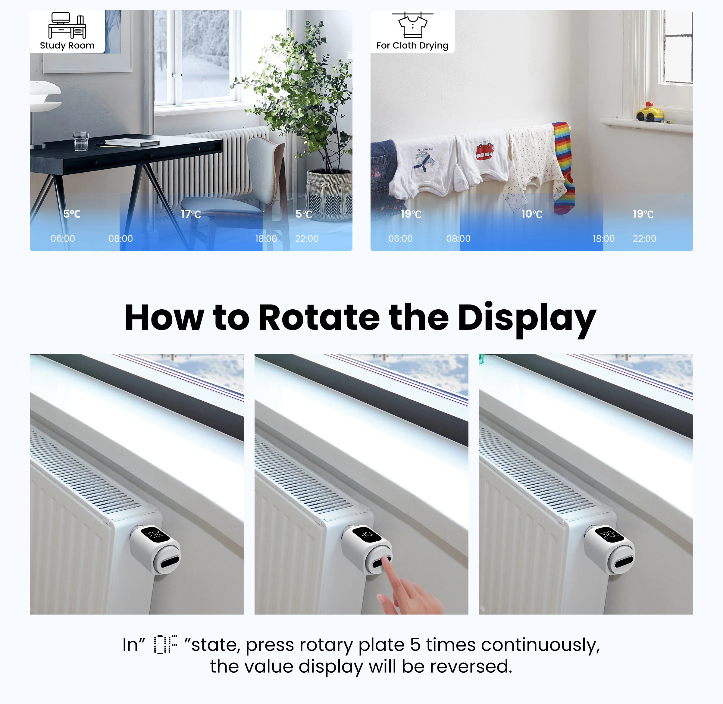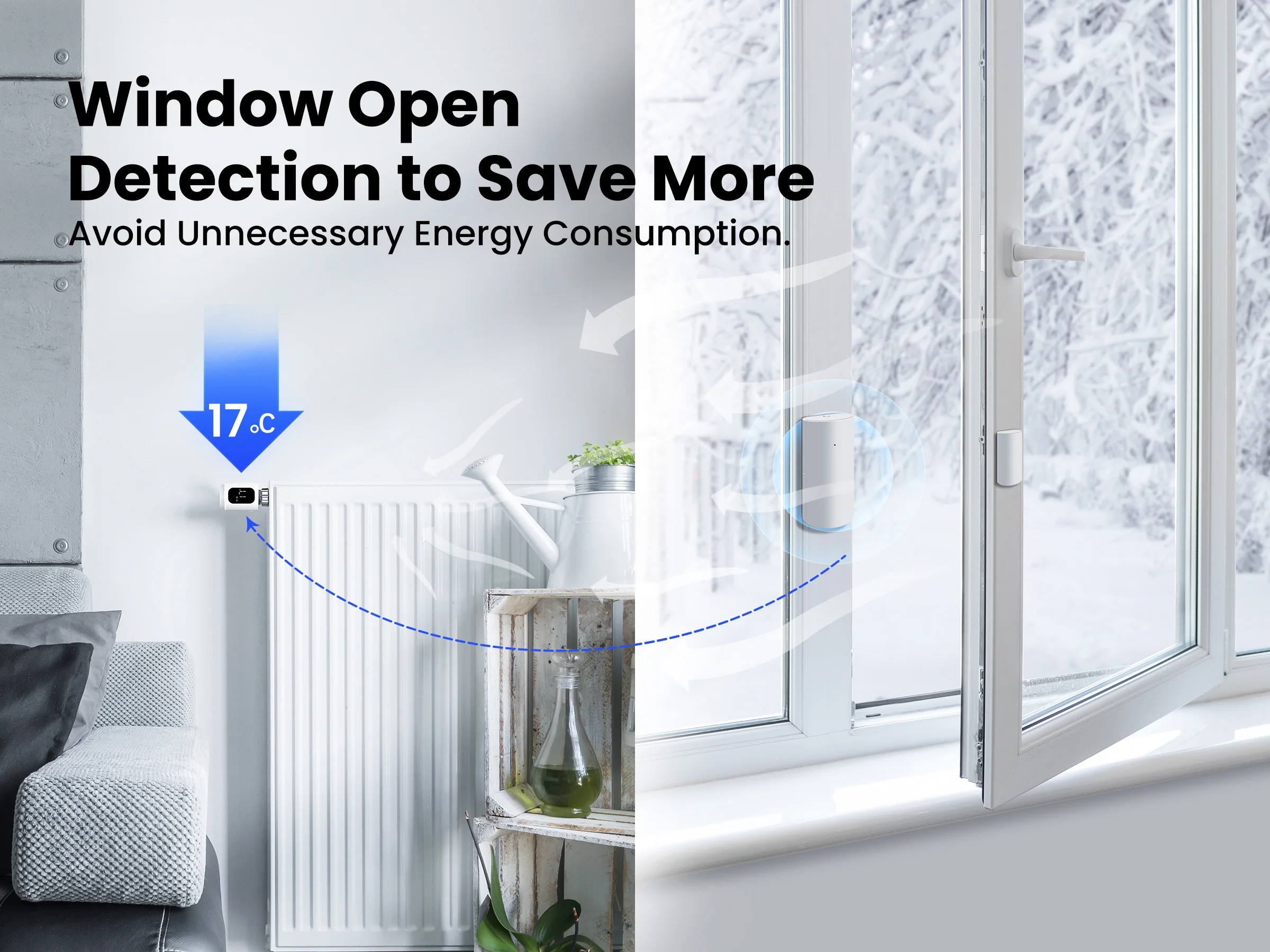 With its window open detection function, the TRV will turn off the valve or reduce heating temperature when detects door/window open to avoid unnecessary energy wasting.