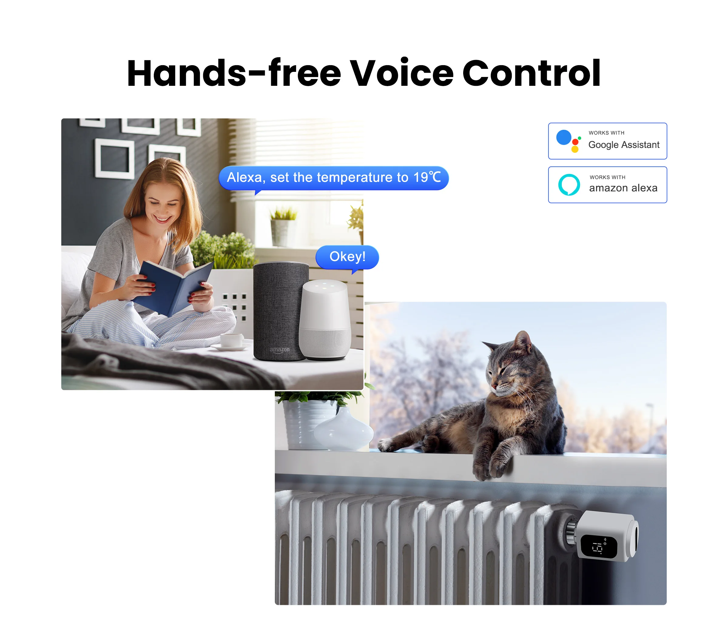 Control your TRV hands-free with Alexa or Google Assistant. Simple voice commands adjust settings and temperatures, enhancing your smart home experience.