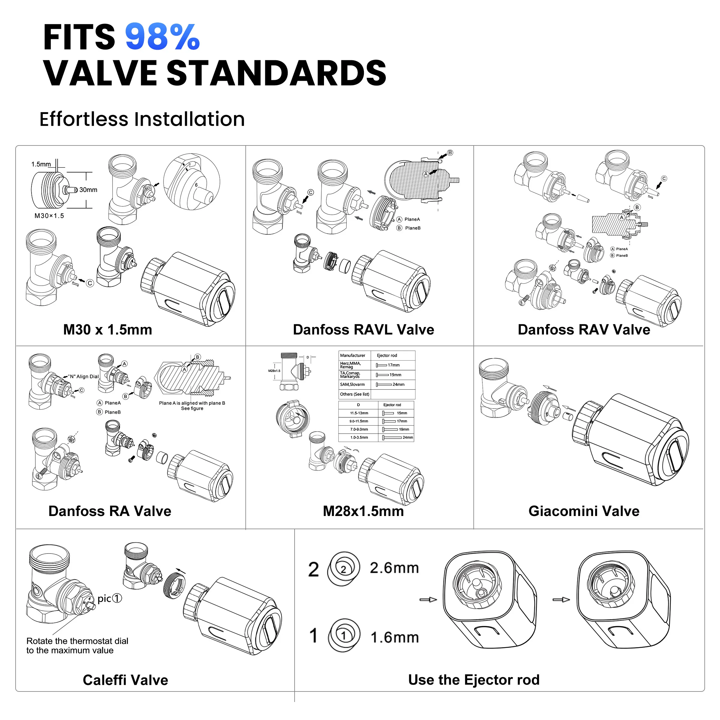 Designed to fit 98%+ of radiator valves, our TRV seamlessly integrates with standard "M30 x 1.5 mm" valves. With included accessories, installation is hassle-free.