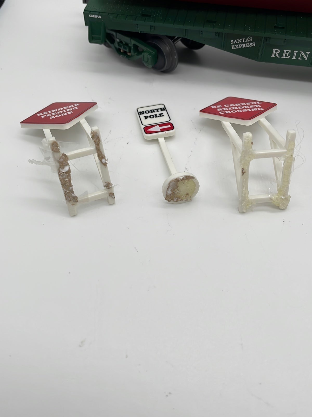 Includes 3 caribou figures, eight wooden barrels, and three signs . The three signs have slight glue on the bottom. See photos for condition