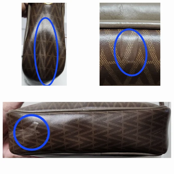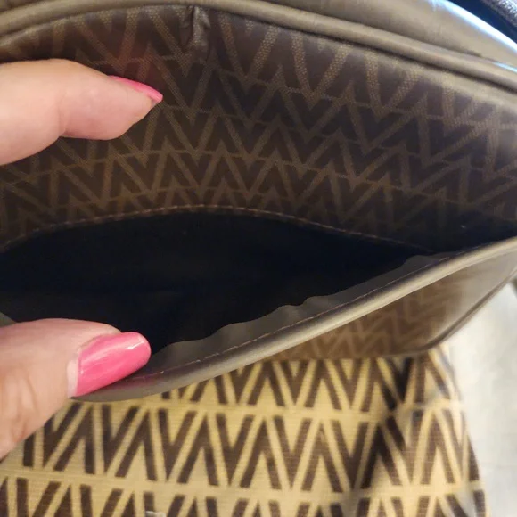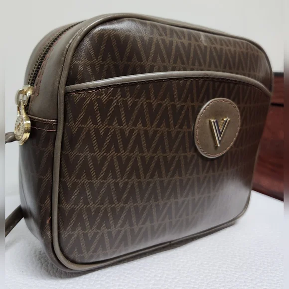 Vintage VALENTINO by MARIO VALENTINO Cute little crossbody!Coated canvas Brown on dark brown V exterior Brown leather trimGold-tone hardware throughout Gold-tone V logo on a round leather badge on frontFront slip pocket Nylon interior lining MARIO VALENTINO Made in Italy gold tone metal badge inside the interior Crossbody strap with a 21-inch drop approximately Zipper top closure with a beautiful gold tone metal brand dual side tag - polished of all tarnish to shine beautifully This is a vintage bag. It is in very good shape. The only issue is that the protective coating has separated in two areas. One in the front top and the other on the left corner side to bottom. I took three pictures for your review.