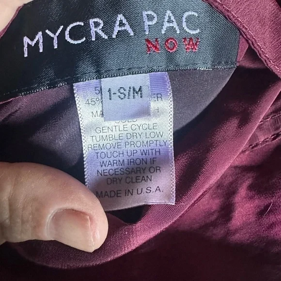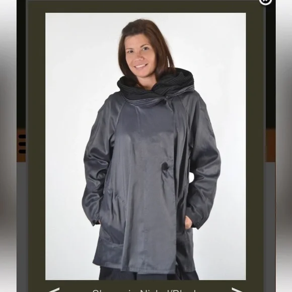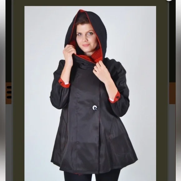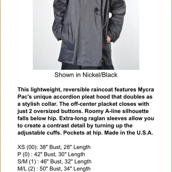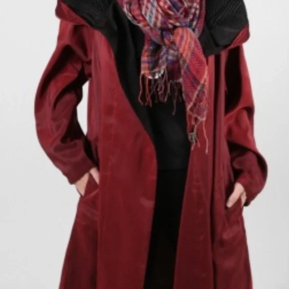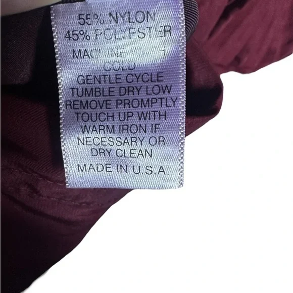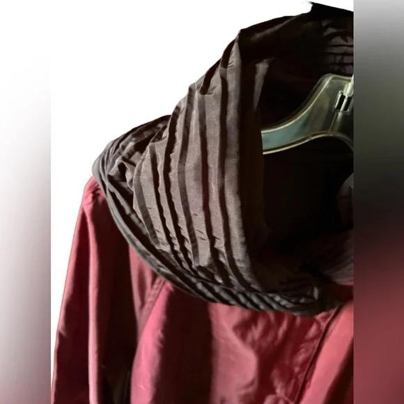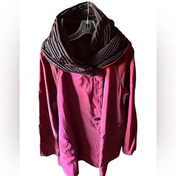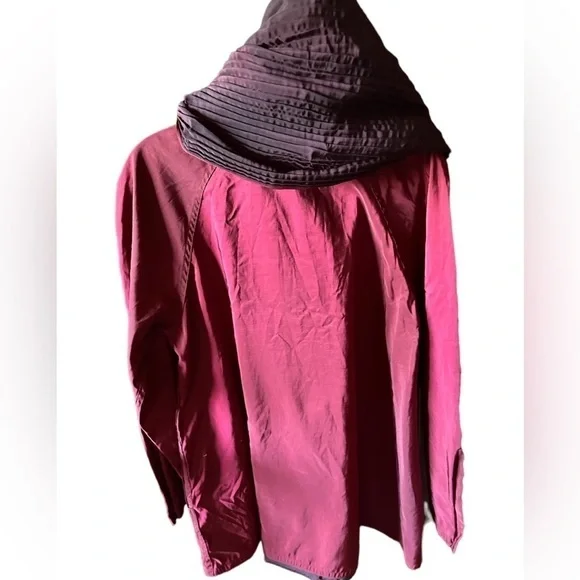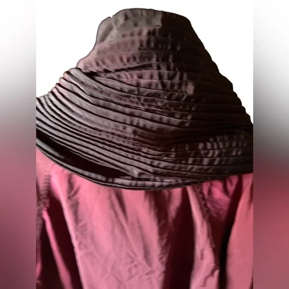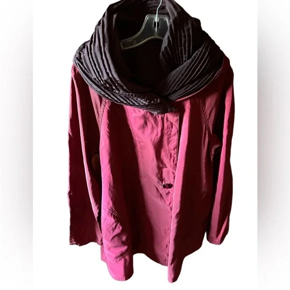 GUC Lightweight and stylish! The perfect packable travel coat! The color combo is beet/black tea. Colors are slightly iridescent and show lighter & darker variations of color in the light. A-line cut for ease of movement, with two buttons and two snap closure. Made in the USA. 55% nylon,45% polyester.