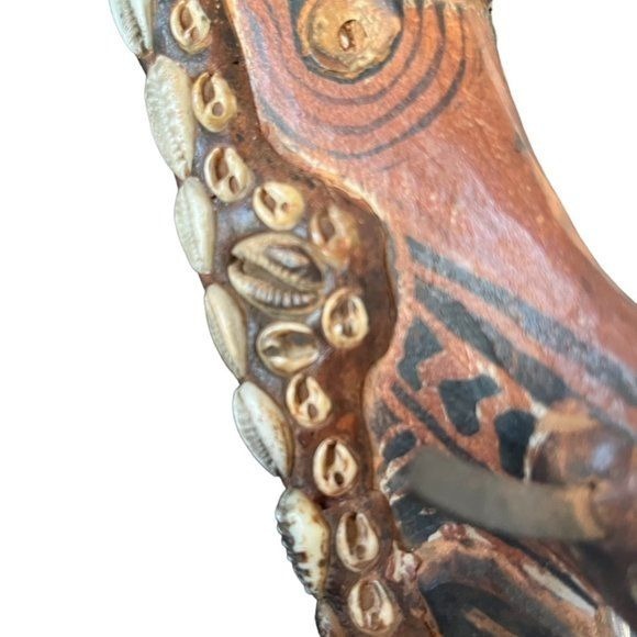 Authentic Very Old Mask - Papua New Guinea - Mei Iatmul - Middle Sepik River Tribal Art Oceanic. Clay ,shells,hair. 19 " long 4.5 wide The Mei masks of the Iatmul people of New Guinea are not face masks, but are tied to a conical structure made of plaited fibers which covers the head and shoulders of a dancer. While similar in shape, the style and decoration of the masks vary by village throughout the Sepik River region. 20th century Mei mask. Wood, pigments, cowry shells, hair and clay.
