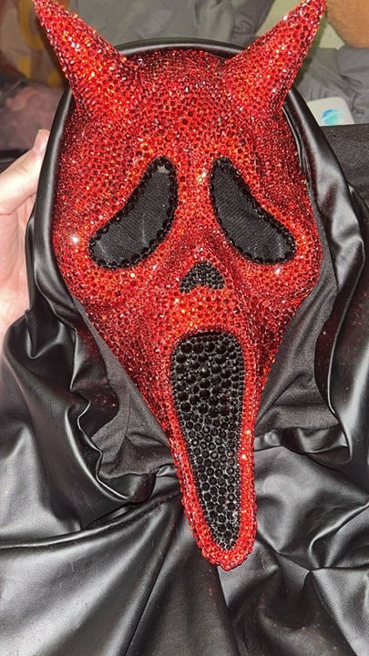 Stand out with this one-of-a-kind custom Ghost Face mask — fully hand-blinged with over 1,500 red + black rhinestones and devil horns for that fiery glam slay