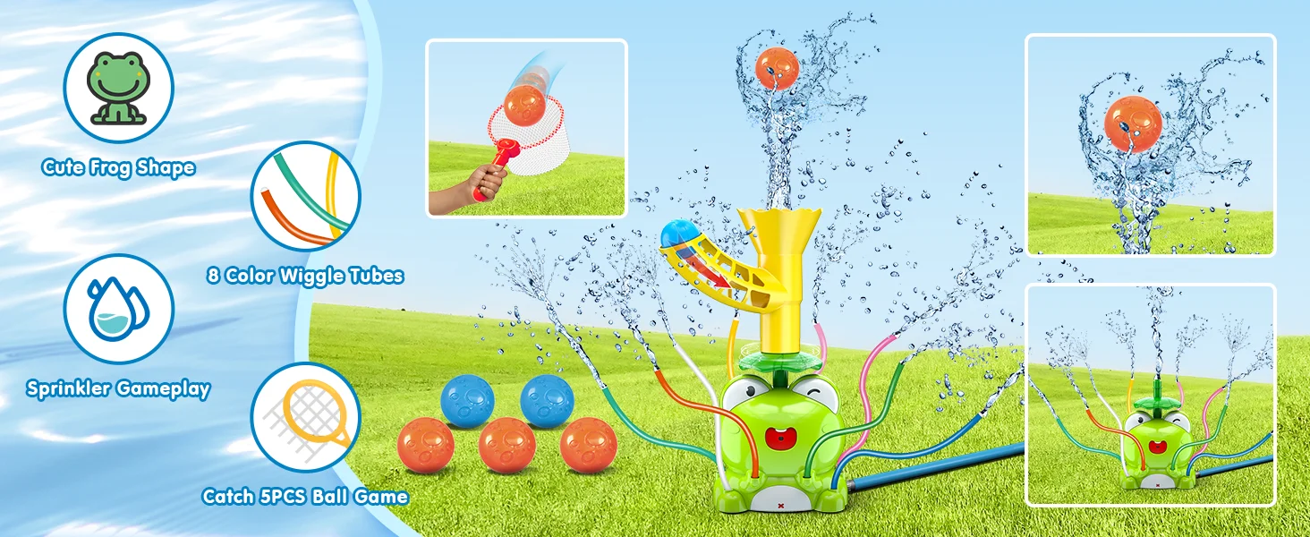 🐸 Fun 2-in-1 Sprinkler Toys: This outdoor sprinkler sprays cool water randomly through 8 different colors of thin tubes, the whole yard instantly turns into a joyful water park; the frog with a ball base on its head is another way to play - the mesh net to catch the ball game, which can exercise the child's reflexes, and increase the fun of the water game!