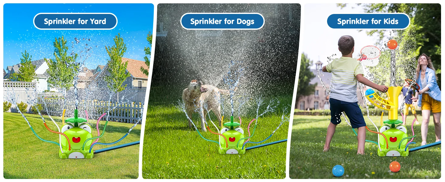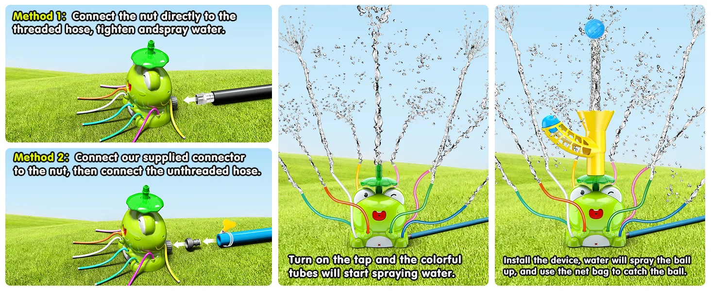 🐸 Simple and Easy to Operate: the children's sprinkler includes a frog body * 1, catch the ball base * 1, small ball * 5, fishing net * 2, locking * 2, hose connector * 1, please refer to the instructions or the installation video, you will be able to easily install it, even if you have never bought a similar product.