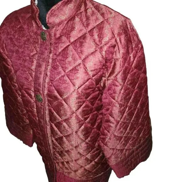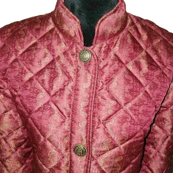 Brand: Gold Label Victoria's Secret Size: Medium Condition: Good Vintage Condition. Please note there are 2 buttons missing but I believe this is still a timeless and beautiful layering piece. The Overall condition is fabulous (other than 2 missing buttons) Color: Red and GoldFeatures: Cropped Sleeves, Unique Paisley pattern, Quilted, Collared, ComfortableSame Day Shipping!