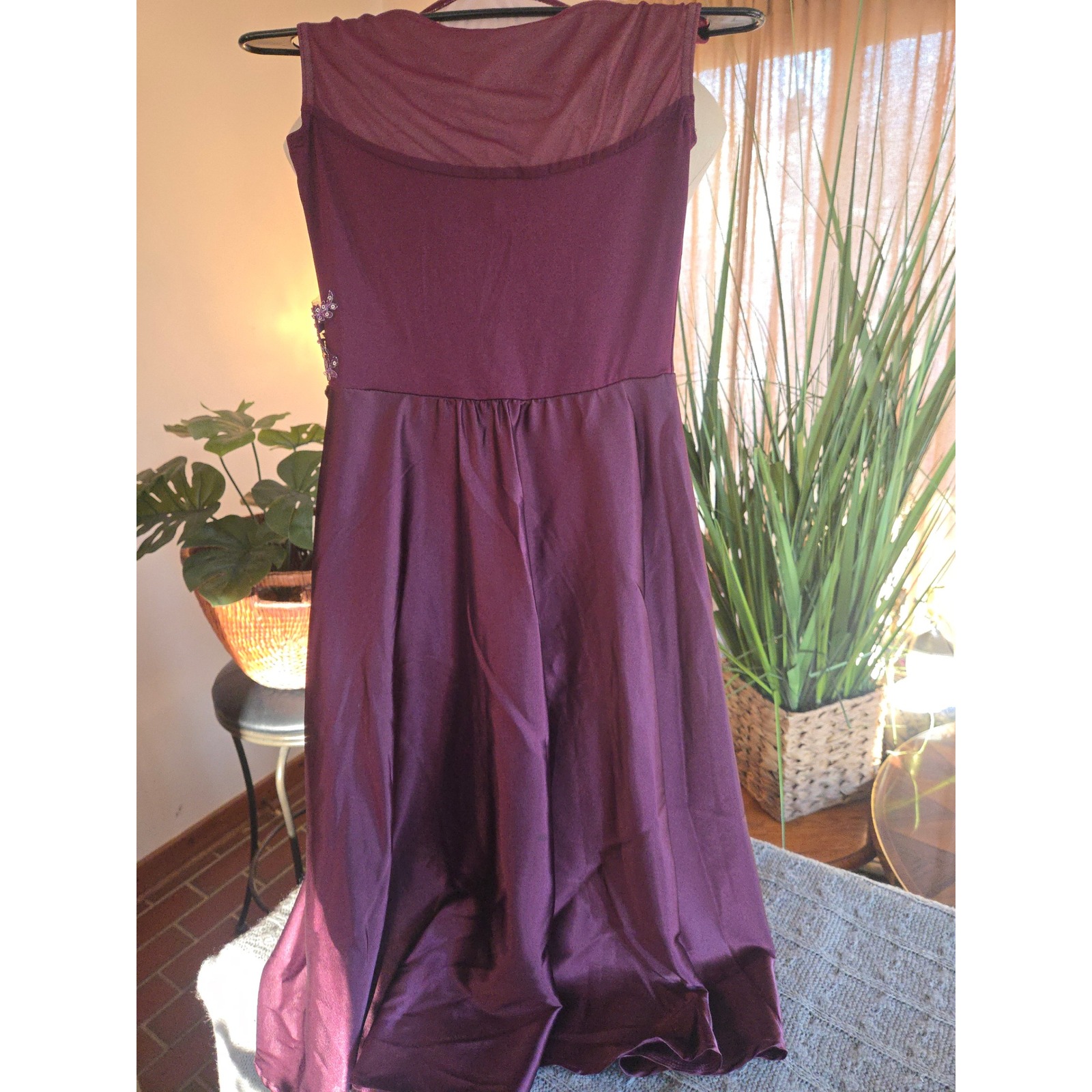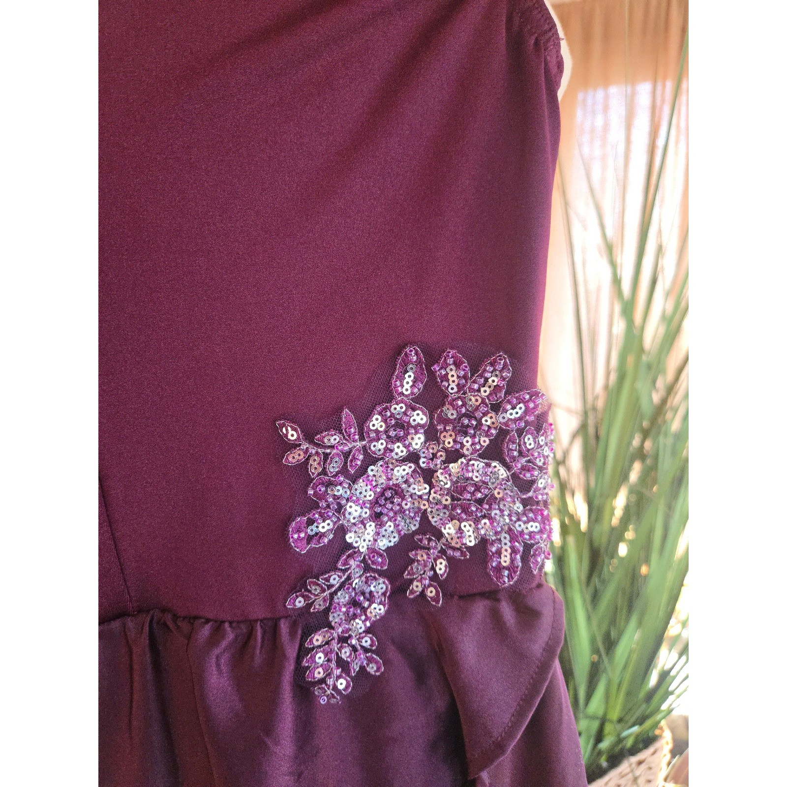 Capture the spotlight with this dazzling Weissman leotard dress. Its rich purple hue is accented with a stunning iridescent beaded and sequined floral appliqué on the bodice, adding a touch of sparkle and glamour. The sheer mesh neckline and cap sleeves create an elegant, sophisticated silhouette, while the layered, asymmetrical skirt adds dynamic movement perfect for any performance. This piece is ideal for gymnastics competitions, dance recitals, or theatrical productions.