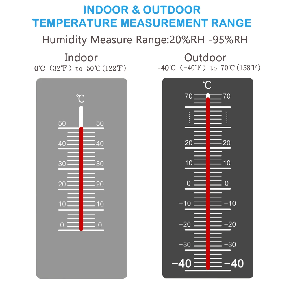 Humidity: Indoor & Outdoor measurable range: 20%RH ~ 95%RH