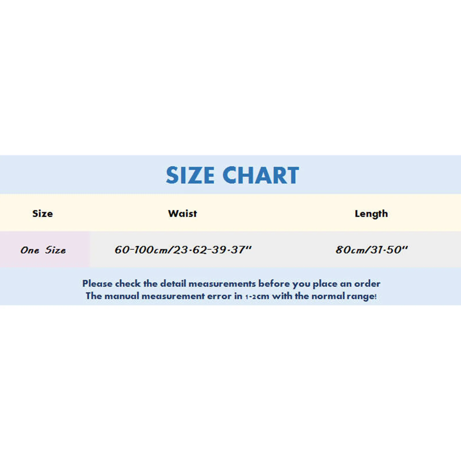 | Size:One Size | Waist:60-100cm/23.62-39.37'' | Length:80cm/31.50'' |