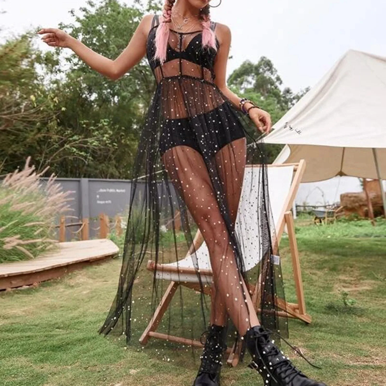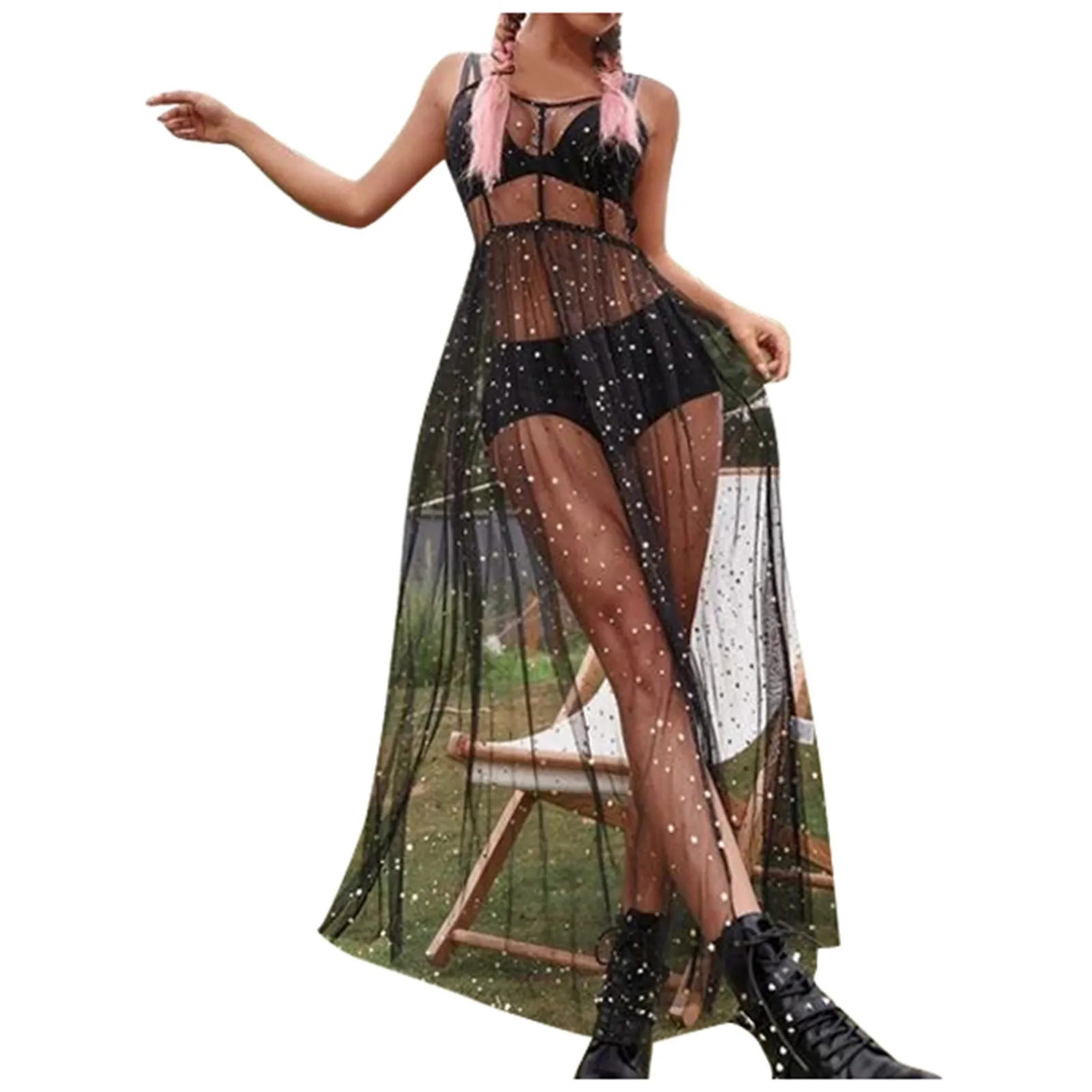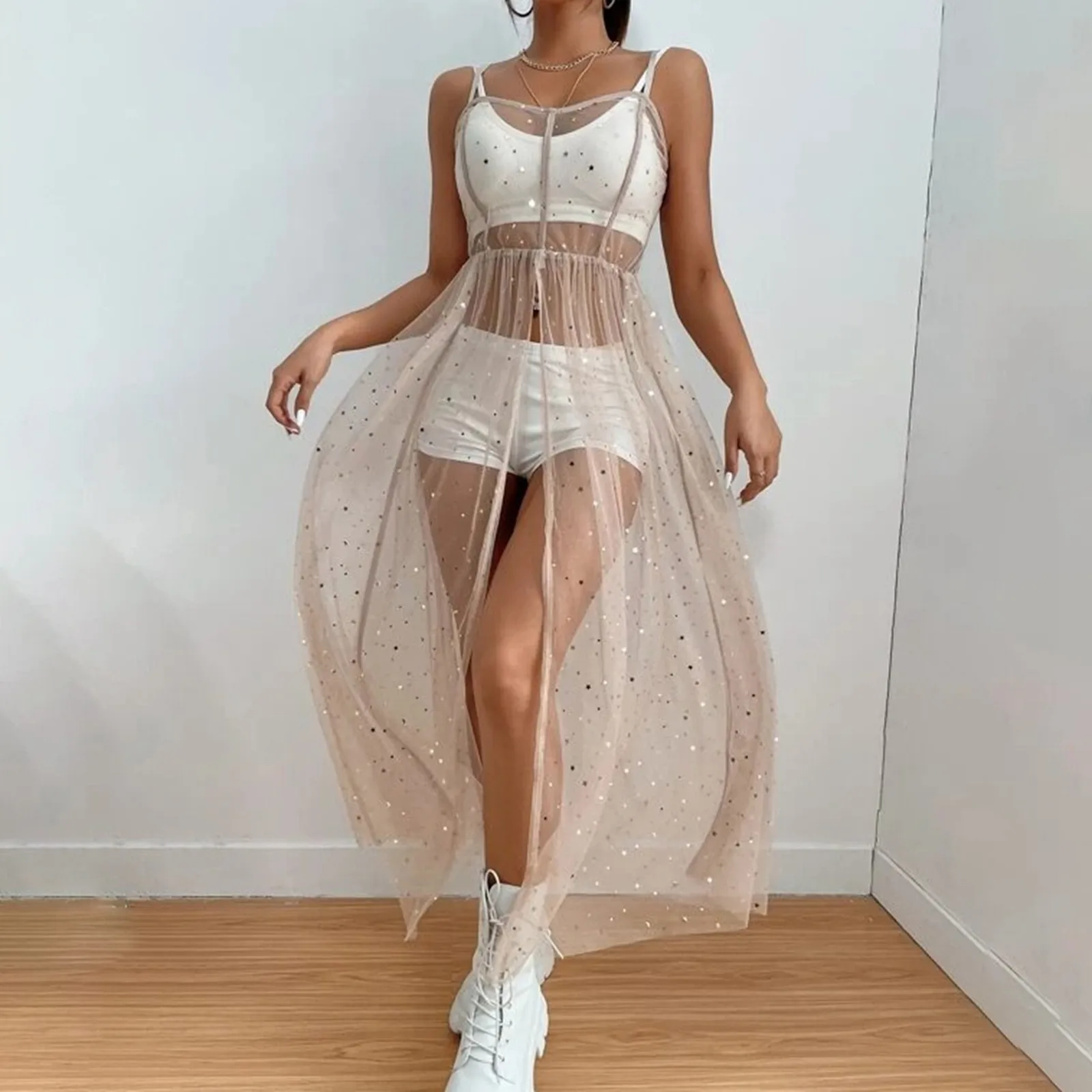 1. Starry Sheer Mesh Cover-Up Dress: A chic and beachwear option with an elegant star pattern.